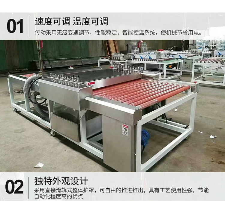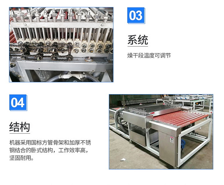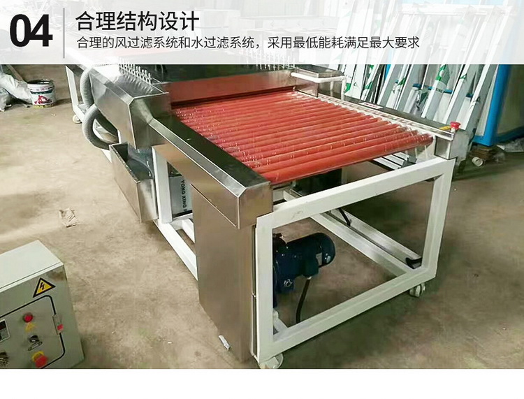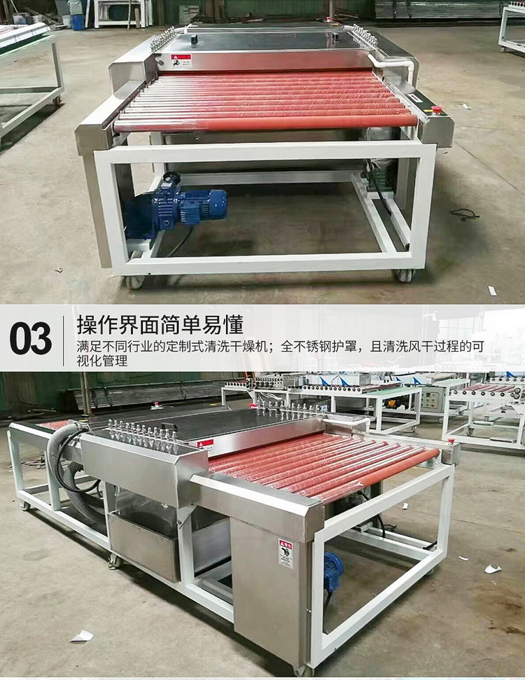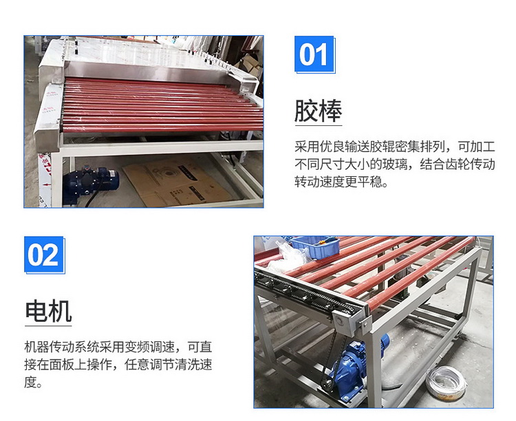 2,玻璃清洗机的胶棍传动采用无级调速和链条旋转,简便确实,容易维护。